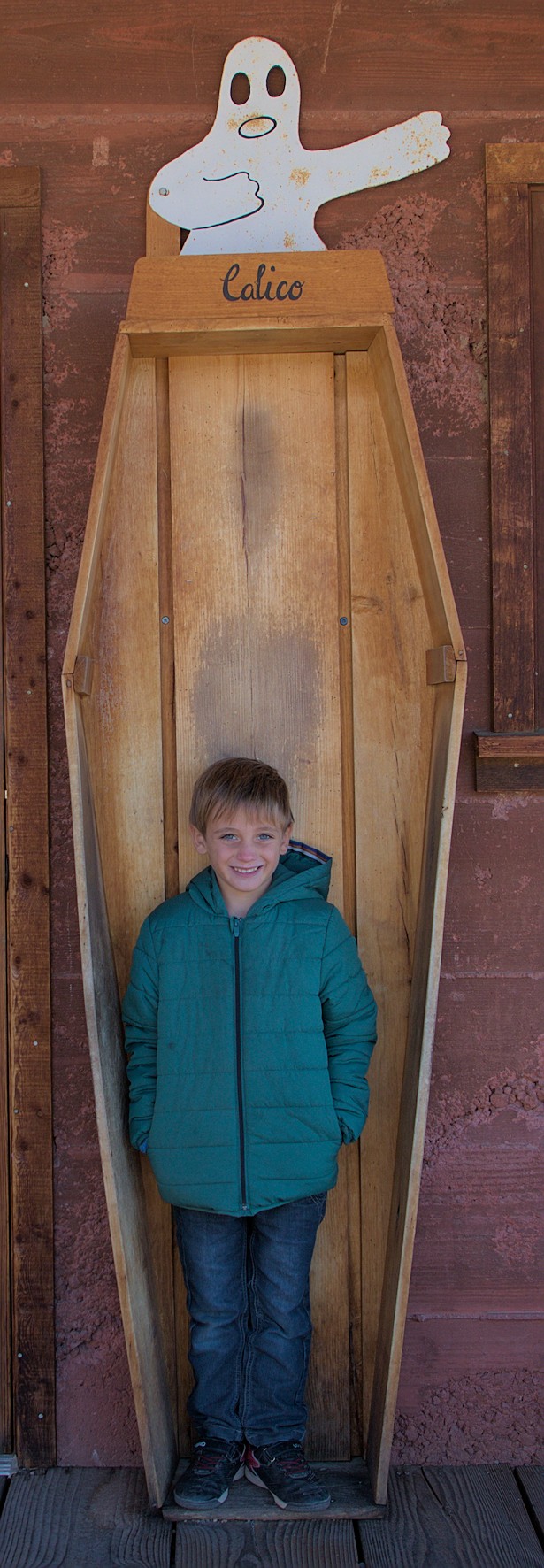 on reprend la route, direction le Joshua Tree Park… mais comme c’est long, on a pris notre petit déjeuner dans un saloon (pancakes, oeufs et jambon à gogo… avec le fameux café maison, qu’on vient te resservir toutes les 30 secondes… même pas le temps de finir sa tasse) et arrêt à la fameuse Ghost Town de Calico, qui est une ancienne ville de mineurs d’or et qui a été reconverti en musée à ciel ouvert. C’était drôle de se promener dans une ville du Far West, de visiter les habitations, l’école, la prison… et puis surtout, on a enfin pu descendre dans la vieille mine, histoire de se rendre un peu compte.